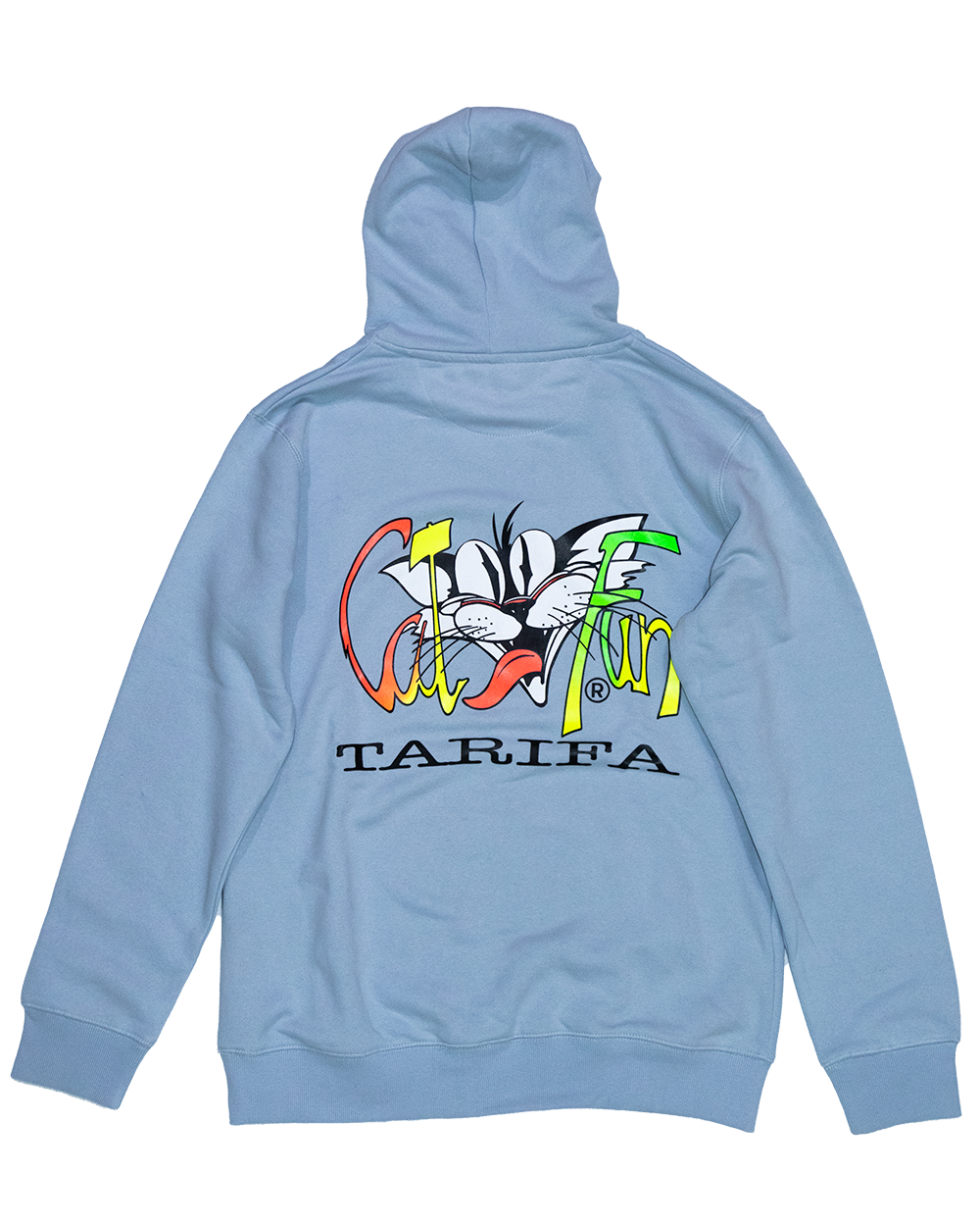 Sudadera de Catfun por Surfer Tarifa. Serigrafía en el pecho y en la espalda. 80 % Algodón Orgánico y 20 % Polyester Reciclado. Desde 1986.